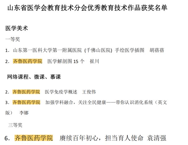 齐鲁医药学院在山东省医学会教育技术分会优秀教育技术作品评选活动中获奖近日,从《山东省医学会教育技术分会优秀教育技术作品获奖名单》文件获悉,齐鲁医药学院4项作品获奖。